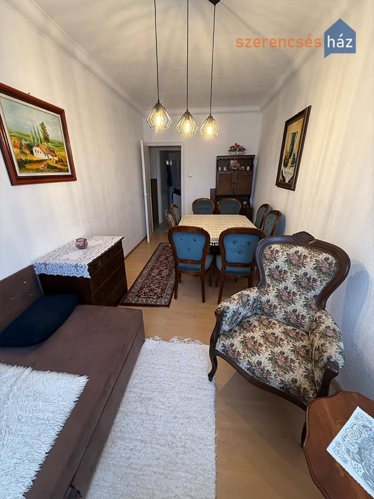 A lakás elosztása: konyha-étkező, nappali, 2 szoba, fürdőszoba, wc, előszoba