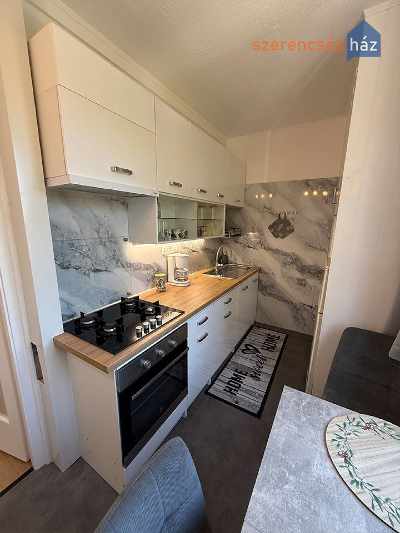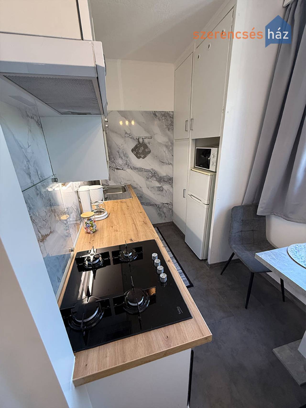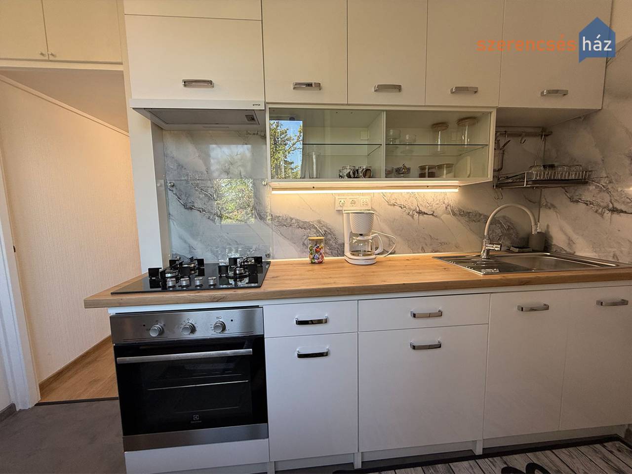 - új, fiatalos konyhabútor, új gázfőzőlap és gázsütő, szagelszívó, új fürdőszoba bútor