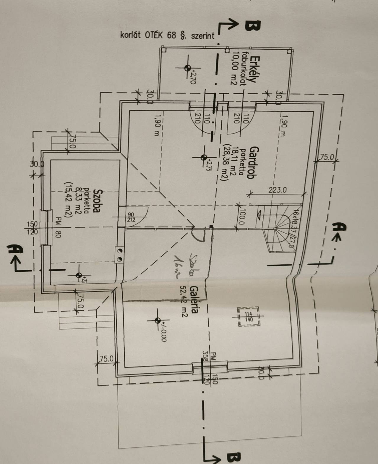 Felső szint: 3 szoba, közlekedő, lépcsőház